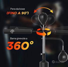 Pungiball con braccio rotante 360 gradi ALLENAMENTO BOXE: Con questo sacco boxe da terra 4 in 1 fai un allenamento completo. Composto da 2 speedball, una barra girevole a 360° per i riflessi e una sacca da boxe rivestita in PU, questo attrezzo multifunzione è perfetto per chi vuole allenarsi al meglio ALTEZZA REGOLABILE: Puoi regolare l'altezza del sacco boxe da terra da 160 cm a 230 cm, per adattare la struttura alle tue esigenze BASE RIEMPIBILE: La base del sacco da kick boxing può essere riempita con acqua, sabbia o miscela di entrambe. In più sono presenti 12 ventose che aiutano a mantenere ancora più stabile il sacco per pugilato. Una volta svuotata la base, puoi spostare facilmente la struttura ALLENAMENTO COMPLETO: Migliora i riflessi, costruisci la tua forza e scarica lo stress. Questo sacco da terra ti aiuta a svolgere workout completi ed efficaci, per allenare velocità, precisione e coordinazione occhio-mano DIMENSIONI: Dimensioni generali: 88L x 50P x 160-230A cm. Dimensioni base: Ø50 x 27A cm. La base può contenere 45 kg di sabbia, 30 kg di acqua o 40 kg di miscela di sabbia e acqua