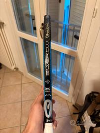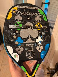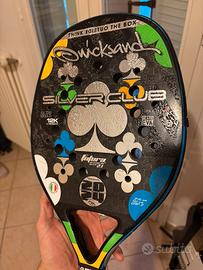 Racchetta da beach tennis con sabbiatura Presenta qualche difetto ma in ottime condizioni! Telaio 100% in carbonio, facciate 100% carbon k 12 lunghezza 50 cm, spessore 21 mm, peso 345 grammi, bilanciamento 25,5 cm Nel ponte della racchetta è presente il sistema Futura 2.1 che riduce circa l’80% delle vibrazioni nocive per le articolazioni dei giocatori.