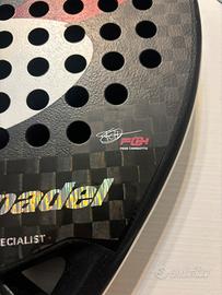 La racchetta presenta dei difetti da usura soprattutto in un lato dove ha uno spacco come da foto. Presenta autografi di Federico Chingotto e Juan Tello.
