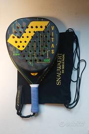 Racchetta da padel Snauwaert Vitas Tour 3D. Ottime condizioni generali. Presenti solo un paio di scalfiture di vernice (vedi foto del particolare) ma assolutamente nulla di strutturale. Peso 370 gr. Bilanciamento basso a 240 mm. Probabilmente la racchetta più potente sul mercato grazie all'esclusiva combinazione della superficie in 3D BRAID CARBON con rivestimento al quarzo + gomma interna EVA 10 gialla, ma con un ottimo feeling e un ampio sweet-spot nella parte superiore grazie alla sua forma ibrida. Prezzo di listino Euro 399,00. Presente sacca originale. Marchio italiano che non ha nulla da invidiare ad altri marchi più blasonati (Nox, Babolat, Bullpadel, Siux,Heroes, ecc.)