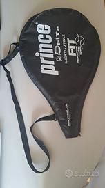 Racchetta da tennis della Prince con logo su rete e propria custodia internamente felpata e con tracolla estensibile.