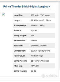 Vendo racchetta da tennis PRINCE THUNDER- STICK MIDPLUS LONGBODY Titanium.
