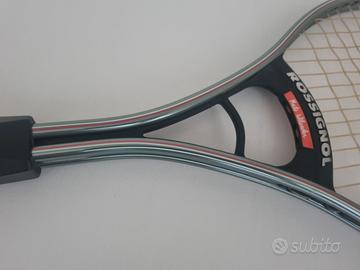 Racchetta da tennis Rossignol usata, che presenta pertanto dei segni di usura e di contatto, sulla testa (punta), sul collo e sul manico, come mostrato in fotografia. Il grip dell'impugnatura è in buone condizioni; necessita di
