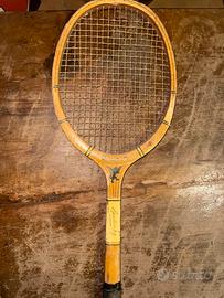 Racchetta da tennis d’epoca in legno, usata, con evidenti segni del tempo. Corde originali. Ideale come oggetto decorativo o per appassionati di vintage.