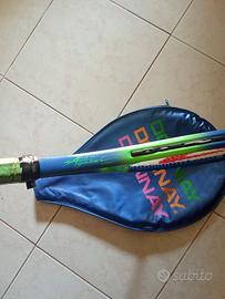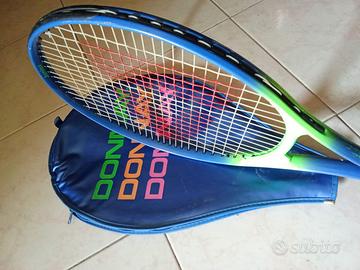 racchetta da tennis Donnay Junior firmata Andre Agassi, un pezzo vintage con la tipica colorazione vibrante blu e verde fluo associata al tennista. Viene fornita con la sua custodia originale blu, che presenta il logo Donnay in grandi lettere colorate (verde, arancione, rosa).