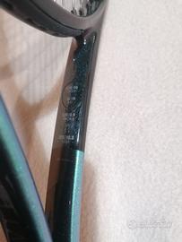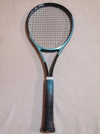 racchetta come da foto, pari al nuovo, usata pochissimo, nessun salto vernice o sfriggi, solo in testa si notano piccolissimi segni di usura. piatto 98, peso gr.305, bil. cm.32, rigidità 59, schema corde 16/19, profilo 22 mm.