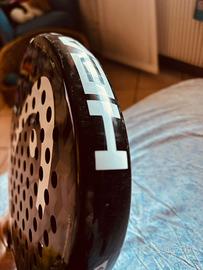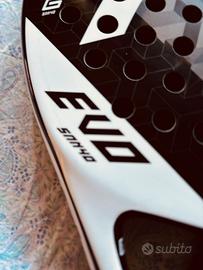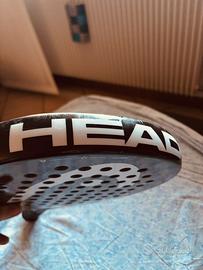 Racchetta HEAD EVO SANYO usata bene con protezione con pellicola in testa Forma: lacrima Spessore: 38 mm Peso: 365 gr Bilanciamento: 275 mm Telaio: carbonio Superficie: fibra di vetro Nucleo: EVA Finitura: liscia Cinturino da polso Livello giocatore: principiante intermedio