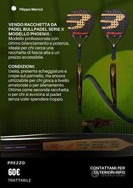 🎾 Racchetta Padel Bullpadel Serie-X Modello Phoenix – 60€ Trattabili Racchetta professionale Bullpadel Serie-X, modello Phoenix, pensata per giocatori che vogliono il giusto mix tra potenza, controllo e sensibilità . 💥 Prezzo di listino: 150€ – La offro a 60€ trattabili per passaggio a nuovo modello. 🛠Caratteristiche tecniche: Forma: A goccia (equilibrio tra controllo e potenza) Bilanciamento: Medio-alto, ideale per colpi potenti senza perdere precisione Peso: 375g Materiali: Telaio in carbonio e fibra di vetro sulle facce, rinforzato con il sistema STReinforce per aumentare la rigidità e ridurre il peso. Il nucleo è composto da gomma morbida per un tocco e un controllo imbattibili. È una racchetta potente ma senza trascurare il controllo che incorpora anche superficie ruvida. Adatta a: Livello intermedio/avanzato, ma accessibile anche ai principianti ambiziosi 📌 Condizioni: Usata, con normali segni di usura, ma ancora perfettamente giocabile e stabile. Nessun danno che comprometta la funzionalità . 💰 Prezzo: 60€ trattabili 📩 Scrivimi per ulteriori info o foto extra!