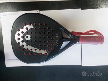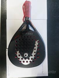 vendo racchetta padel head Coelho pro usata anno 2025,usata poche volte presenta qualche piccolo segno sul prottettore e una leggera graffiatura di vernice sotto la scritta COELLO PRO vicino alla base del telaio