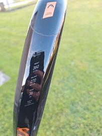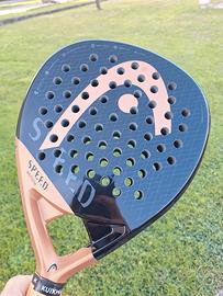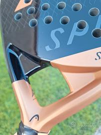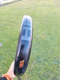 Racchetta leggera (360 gr) consigliata per giocatori di livello intermedio e avanzato. Ottima reattività e nel gioco offensivo. Usata solo 4 mesi. Cambio per passaggio ad altra pala con maggiore controllo. Tenuta molto bene. Due segni sul nastro protettivo per tocco a parete, come da foto.