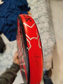 La racchetta é in buono stato, presenta solo segni di usura nelle parti laterali e nella parte alta, le due facciate invece sono in perfetto stato, stessa cosa per il manico.