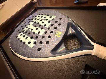 Telaio 100% carbonio, piatto rugoso e design a esagoni. Ideali per giocatori intermedi che cercano controllo, stile e comfort. Con laccio di sicurezza scorrevole integrato.