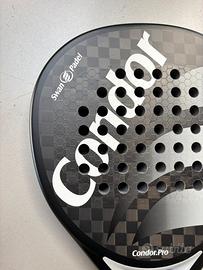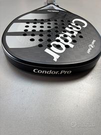 Racchetta nuova, comprensiva di custodia Forma: lacrima Telaio: 100% carbonio Piatto: carbonio 12k superficie con rilievo trid. Nucleo: gomma Eva soft Peso: 360g/-10g Spessore: 38mm Bilanciamento medio Una racchetta polivalente con un ottimo equilibrio fra potenza e controllo. Condor PRO ha un formato a lacrima e viene costruita con i migliori materiali disponibili. Il piatto è realizzato in carbonio 12k con rilievo geometrico tridimensionale in grado di massimizzare gli effetti sulla palla.