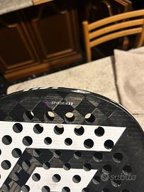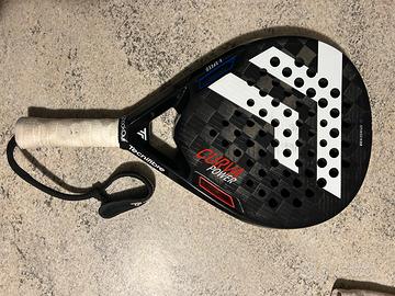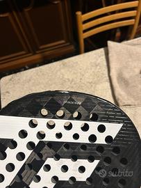Pala in ottimo stato anche se presenta qualche salto di vernice in testa i piatti sono perfetti Usata solo per una ventina di partite Pala di forma a goccia con peso di 365 bilanciamento medio alto piatti da 18k con gomma eva soft Polsino t91 nero in omaggio