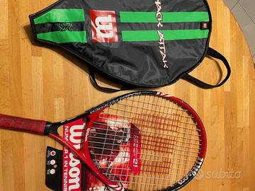 Wilson ROGER FEDERER 21. Creata sulla scia del design dell’iconica linea Pro Staff, la racchetta Roger Federer 21 combina uno stile elegante con prestazioni eccellenti. Segui i passi di un campione con un telaio che offre tantissima leggerezza, potenza e stabilità ai giocatori più giovani. La racchetta include una protezione dagli urti sulla parte superiore del telaio per prevenire i danni sulla superficie del bordo.