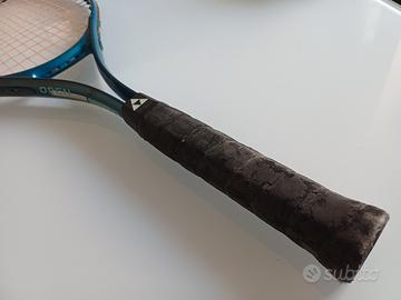 Racchetta da Tennis Fischer con qualche segno di usura nel tempo, nello specifico vi sono alcuni graffi sparsi e il manico è usurato completamente da rigenerare, perché imbratta le mani di colore nero.
