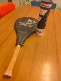 Racchetta Maillot Savarez Gialla e blu con custodia salva battuta grigia.Misure larga 23cm. lunga 67cm.+ 1 confezione di 4 palle Babolar team.
