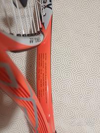 Il telaio è complessivamente in buono stato anche perché non ci ho giocato molto. Di solito gioco in inverno perché in estate lavoro come accompagnatore in montagna. Incordata Yonex PolyTour bianca (1,23 o 1,25mm, non ricordo) usate al massimo 10 ore. Vendo a malincuore perché mi hanno regalato una nuova racchetta.