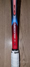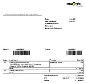 Vendo racchetta Yonex Vcore 98 in condizioni pari al nuovo, con 3 ore di gioco, acquistata l'11 marzo 2026 su Tennis-Point.it al prezzo di 211.95 Euro (vedi foto della fattura). La misura del manico è 4. La racchetta è venduta incordata con corde monofilamento Oehms Black Pearl Rough 1.21 tirate a 22 kg, con l'overgrip nuovo appena sostituito (Wilson Pro) e con l'antivibrazioni Yonex originale. Fornisco anche la header card e il sacchetto originali (vedi foto).