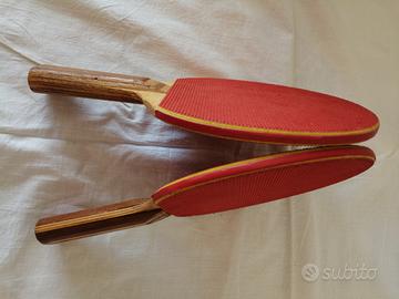 Racchette da ping pong rosse e gialle. Misure: 15,5cmx26,5cm, h 2cm. Qualche segno sul manico e sulla gomma.