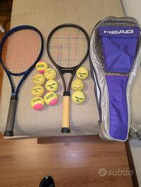 1 racchetta da tennis Wimbledon magnesium. 1 racchetta tennis Head 660 Orion. 1 borsa Head porta racchette. 10 palline da tennis.