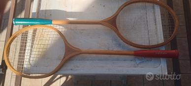 due doppio antiche racchette dadminton (tennis) volano legno sane conservate una manico rosso altra verde marcate: -sport - vintage