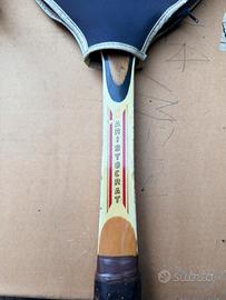 La racchetta a sinistra è una Spalding Rancho Gonzales, dotata del suo tensore in legno originale per mantenere la forma del telaio,.
