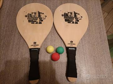 Coppia di racchettoni costituiti da quattro racchettoni in legno più tre palline, uno dei quattro racchettoni presenta una piccola imperfezione provocata dall'usura. L'ho cerchiato di rosso, nel complesso sono in ottime condizioni ma sono sempre di seconda mano.