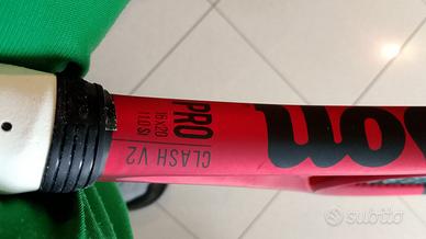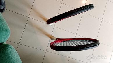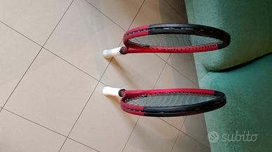 Coppia di racchette Wilson Clash pro V2 come da foto. In ottimo stato, una praticamente nuova, una usata per qualche ora. Manico L4, ovale da 100, peso 310 gr. incordate con monofilamento Morbido (non ricordo quale), tensione residua intorno a 23 Kg Tecnica racchetta Bilanciamento 305 mm schema corde 16-20 ovale 100" - 645 cmq RA circa 57-58 profilo 24.5 Tecnologie Chiave Dichiarate FORTYFIVE°: La costruzione del telaio protetta da brevetto che aumenta la flessibilità e la stabilità all'impatto. Questa tecnologia permette alla racchetta di flettersi in modo da assecondare i moderni movimenti verticali dello swing. Costruzione della Punta Migliorata: Wilson ha rivisto la struttura sulla parte superiore dell'ovale per aumentare significativamente lo sweet spot (zona ideale di impatto), rendendo la racchetta più tollerante nei colpi decentrati. Agiplast: Per ridurre l'impatto ambientale, il tappo del manico, i passacorde e il paracolpi sono realizzati in polimeri biodegradabili di origine vegetale. Design Anodizzato: Una finitura rossa opaca ("Infrared") con il logo Clash impresso direttamente sul cuore della racchetta per un look premium