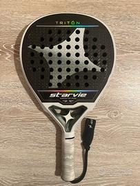 Vendo rachetta da padel Starvie Triton Pro, in condizioni ottime, peso di circa 375g. Disponibile per visione su Bari. Unico graffio, visibile in foto, sopra la scritta Triton.