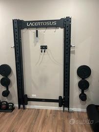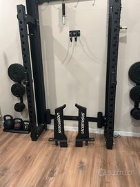 Articolo originale, usato quattro mesi non costantemente completo di tutti i suoi componenti due porta bilancieri, due ganci per rack bilanciere e due enormi bracci per stacco o rematore o militari press multifunzionale perfetto ottime condizioni già smontato, pronto da caricare e portare via