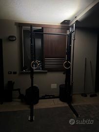 Vendo set completo per allenamento a corpo libero e con pesi composto da: Rack con sbarra per trazioni regolabile e stazione dip (agganciabile alla struttura). Bilanciere olimpico con portata di 450kg e porta bilanciere attaccato alla struttura. Ferma pesi in plastica easy lock. Set di pesi (bumpers) per un totale di 130kg, divisi in 2 coppie da 5, due coppie da 10, una coppia da 15 e una coppia da 20. Coppie di micro carichi da 1.25kg e 2.5kg. 2 supporti per dischi da agganciare alla struttura. Il tutto si presenta senza imperfezioni, se non alcuni segni di usura dovuti all’utilizzo. Eventualmente su richiesta posso vendere anche un paio di accessori, come ad esempio gli anelli, la corda, il tappetino da yoga e una stazione per addominali. Se comprate tutto insieme ve li regalo.