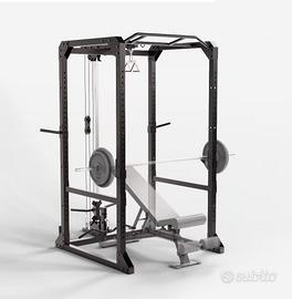 Rack con possibilità di effettuare lat machine , rematore (con appositi manubri già inclusi) , squat , panca piana ed inclinata . Includo panca piana e bilanciere( z )