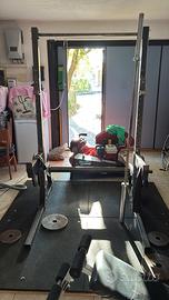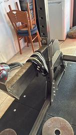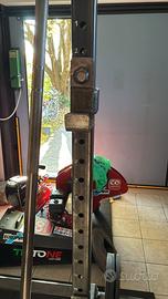 Sia i porta bilancere, che i bracci di sicurezza sono regolabili in altezza. Ci sono 20 fori di regolazione posti ogni 6cm. Presenta sbarra per trazioni e due tubi porta dischi.