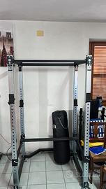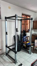 Misure di ingombro 120x120 H. 210cm Peso: 90kg Spazio interno di lavoro effettivo 104x76 H 200cm Portata massima complessiva 350kg Barra delle trazioni maggiorata Ø 33 e supporta fino ad un carico massimo di 250Kg Sicurezze e ganci sono regolabili in 25 posizioni diverse, con scarti di 5cm tra ogni posizione Due coppie di ganci a J compatibile con tutte le powerbar Supporti parallele per dips già inclusi nel kit Contattare solo se realmente interessati