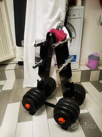 Rak porta manubri, compreso 4 manubri vuoti più due manubri modulabili da 25 kg cad