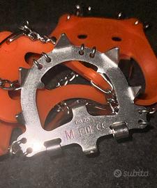 Vendo coppia di ramponcini (micro-spikes) della DF Mountain, ideali per escursionismo invernale, trekking su sentieri ghiacciati o innevati e outdoor. Il prodotto è in condizioni eccellenti, non utilizzato perche della misura errata. Caratteristiche principali: • Marca: DF Mountain (modello tecnico con catene e punte in acciaio). • Taglia: M (visibile punzonatura sul metallo). • Struttura: Fascia elastica in silicone arancione ad alta resistenza, facile da calzare sopra qualsiasi scarpone o scarpa da trekking. • Trazione: 13/14 punte in acciaio collegate con catene robuste per il massimo grip su ghiaccio e neve dura. • Sicurezza: Certificati CE. PREZZO TRATTABILE
