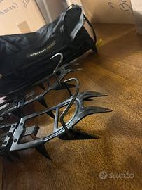 Paio di ramponi Charlet Moser originali (marchiati sulla barra centrale), modello vintage. Struttura in acciaio, regolazione a barra con fori, attacco classico (gabbia frontale + talloniera a filo metallico). Denti integri, usura estetica coerente con l’età ma strutturalmente solidi. Adatti a collezionisti, appassionati di materiale storico, o per chi cerca un set economico per escursioni su neve compatta (non attività tecniche o verticali).