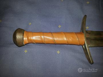 Riproduzione di una daga medievale. Tagliata e battuta a mano. Elsa rivestita in cuoio. Fedelmente ricostruita in materiale e peso, senza filo e senza punta.