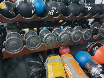 Rastrelliera in legno e ferro in ottime condizioni per un homegym. Rastrelliera con aggiunta di coppie di manubri rispettivamente da 5,5kg 11,5kg 13,5kg. Materiale usato ma ancora in ottime condizioni allestire una palestra zona manubri/specchi.