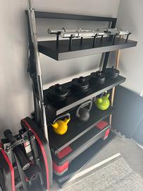 Rastrelliera fatta su misura (mio padre è un fabbro) misure 130x90x30 Con: - 16 dischi da 1 kg - 3 kettlebell (8-12-16kg) - 4 manubri da 2kg - 1 bilanciere - 1 step - Panca - Elastici vari - Ball gonfiabili (1 grande e 1 piccola) Euro 399. Nichelino (TO)