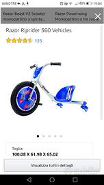 Triciclo Razor RipRaider 360, ruota a 360 gradi, portata max 75 kg. Molto divertente sia per ragazzi che per adulti. Prezzo del nuovo 166 euro, vendo a ottimo prezzo
