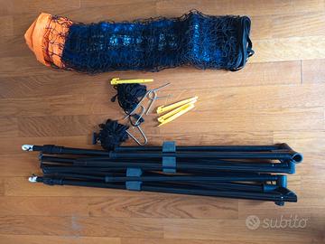 Rete da pallavolo Decathlon con paletti e corde per bloccaggio. Altezza modificabile da 107cm a 155cm. Praticamente nuova, usata solo una volta