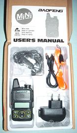 Mini Baofeng BF-T1 (pezzo singolo) Le sue dimensioni ultracompatte permettono di portarla praticamente ovunque e usarla in qualsiasi occasione: caccia, pesca, raccolta funghi, escursionismo, lavoro, ecc. È dotata di una batteria 1500mAh ricaricabile che fornisce una lunga autonomia. La T1 si é rivelata uno dei modelli piú riusciti della Baofeng. MINI RICETRASMITTENTE FM/UHF ANTENNA INTEGRATA 20 CANALI GAMMA DI FREQUENZA: 400-470 MHz STEP FREQUENZA: 12.5/25 KHz POTENZA DI TRASMISSIONE PROGRAMMABILE 0.5W / 1W IMPEDENZA ANTENNA 50Ω DISPLAY ILLUMINATO CON FUNZIONE RISPARMIO ENERGETICO BOTTONE PER INVIO SOS RADIO FM TORCIA LED NELLA PARTE SUPERIORE DIMENSIONI 108mm x 55mm x 21mm PESO 120g (BATTERIA INCLUSA) BATTERIA RICARICABILE Li-Ion 3.7V x 1500mAh CARICA BATTERIE USB E CAVO INCLUSI AURICOLARE CON MICROFONO, PTT E CLIP DI AGGANCIO INCLUSO CLIP POSTERIORE PER CINTURA (RIMOVIBILE) CORDINO PER TRASPORTO A MANO PROGRAMMABILE DA PC MANUALE D'USO N.B.: giá programmata con i 16 canali liberi PMR446 + 4 canali liberi LPD (di solito quelle reperibili sui siti online non sono programmate con le frequenze legali in Europa). Posso fornire (su richiesta) il cavo per la programmazione da PC.