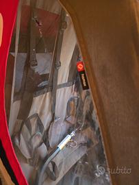 Rimorchio Hamax rosso per il trasporto di n°2 bambini. E' ripiegabile, può essere collegato ad una bicicletta mediante braccio specifico incluso od utilizzato come passeggino a spinta mediante kit incluso. Il rimorchio è ripiegabile e le ruote smontabili. E' in ottime condizioni, sono presenti due piccoli taglietti su una delle due finestre laterali in pvc, ma nulla da comprometterne il funzionamento e l'estetica.