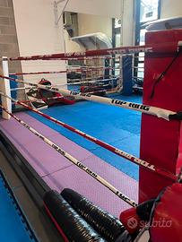 Ring da Boxe pugikato e kick boxing . Struttura di ferro molto solido 5mt x 5mt con 4 corde e 4 angoli imbottiti . Vendo eventualmente tatami 25 pezzi a 10€ l’uno a parte . Non spedisco