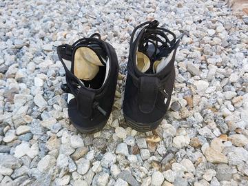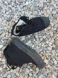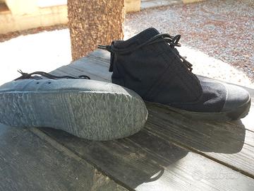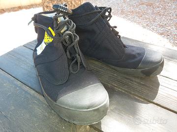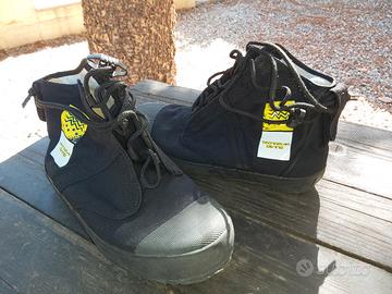 Calzari per muta stagna Rock Boot misura 42 italiana. Realizzati in Cordura HD e suola in gomma antiscivolo. Stringhe con clip plastica serraggio e passanti in fettuccia cucita (niente occhielli metallici che cedono). Passante con velcro posteriore per fissare lacci. Sono a pianta larga perché prodotti da azienda che sa come devono essere i calzari da abbinare a muta stagna. Non trattabile.