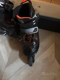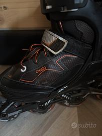 Pattini in linea marca Oxelo numero 32-35 in ottime condizioni. Solo uno dei due pattini ha un piccolo difetto superficiale nella scarpa come di vede nell’ultima foto. Sono stati usati poco come di vede dalle gomme
