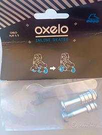 Pattini in linea per bambina Play3 decathlon, con possibilità di mettere in parallelo le ultime 2 ruote e di regolare la dimensione della pianta.