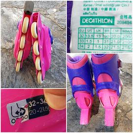 Rollerblade per bambina Oxelo marca Decathlon, colore rosa fucsia e viola, completi di sacca per trasporto.